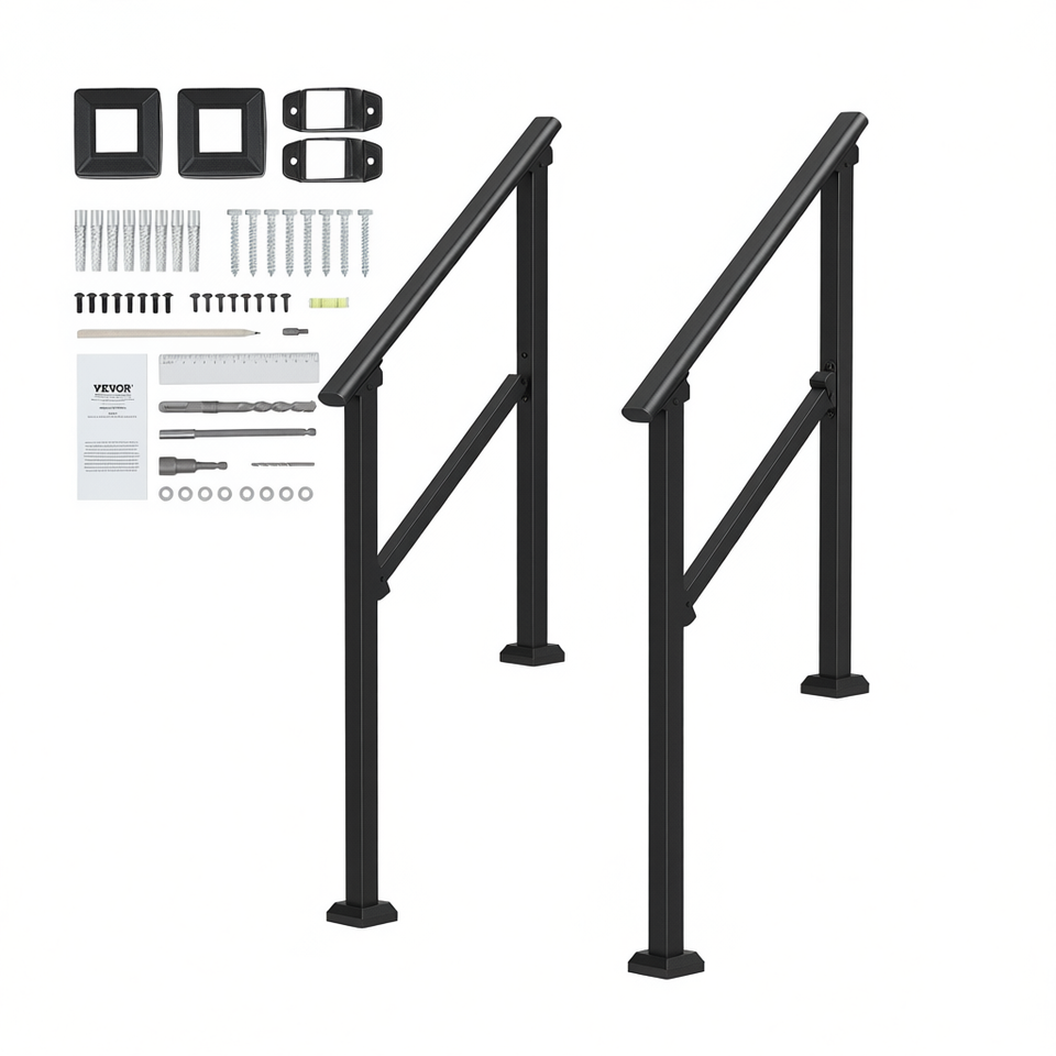 VKVOR Outdoor Black Square Tube Handrails 2 Pcs Steel Porch Deck Stair Parts Modern Design