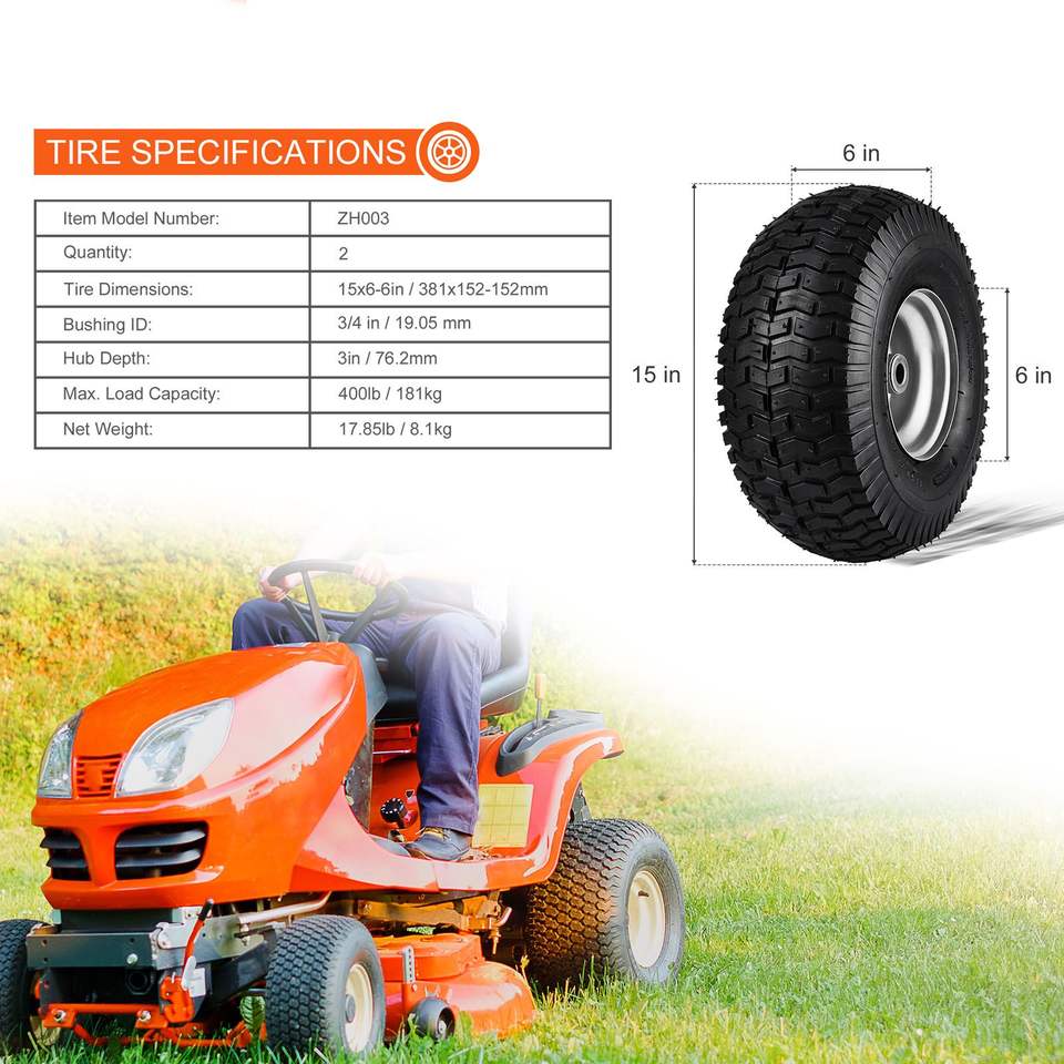 Set di 2 pneumatici per tosaerba 15x6-6 pollici con mozzo centrale da 3 pollici e ruote da 3 pollici per trattorini rasaerba e ruote girevoli