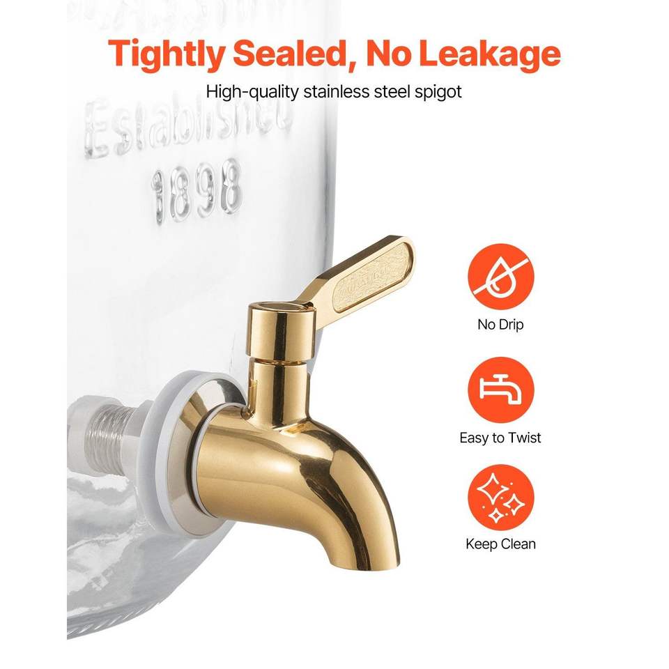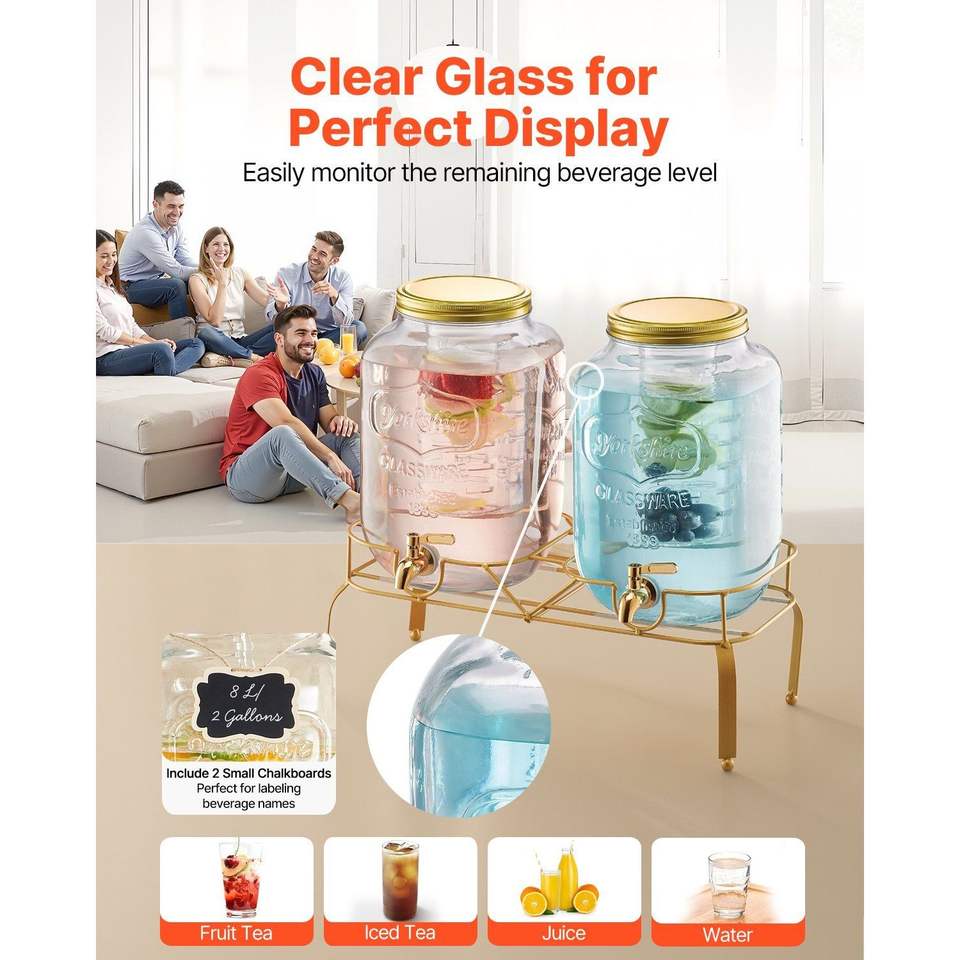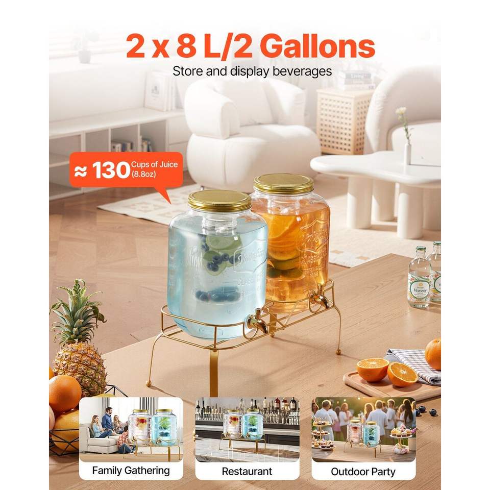 Set di 2 Dispenser per Bevande in Acciaio Inox da 2 Galloni con Supporto Spigo, Dispenser per Succhi in Vetro per Feste e Servizio Bevande