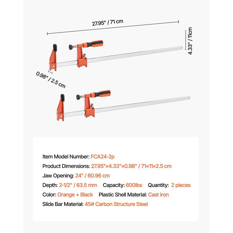 Set di 2 Morsetti a C in Ghisa da 24 Pollici, Capacità di Carico 600 Libbre, Profondità 2-1/2 Pollici, Morsetti Bloccabili per Falegnameria