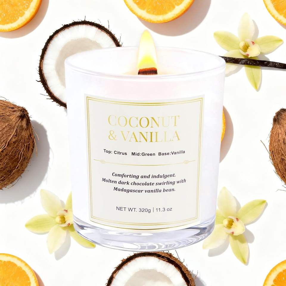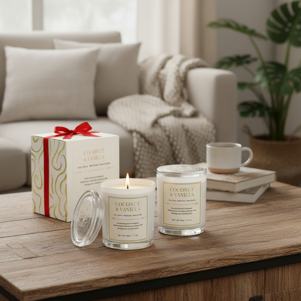 Set di 2 Candele Profumate al Cocco e Vaniglia, Lunga Durata, Stoppino in Legno, Cera di Soia, Confezione Regalo per le Festività con Eleganti Scatole