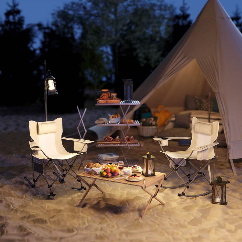 2 Pack Cream Folding Rocking Camping Chairs Portable with Comfort Headrest Cooler Bag Cup Holder & Carry Bag