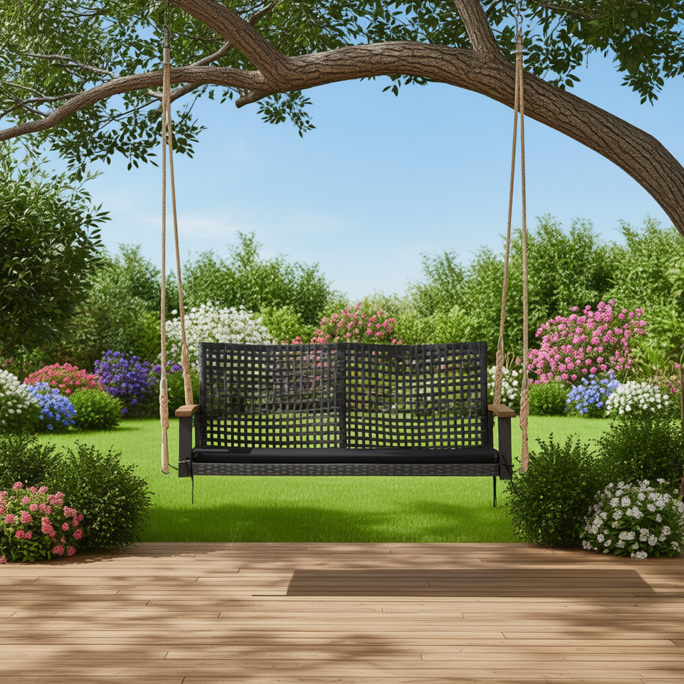 Dondolo da Giardino a 2 Posti in Vimini Nero, Design Sospeso per Relax all'Aperto