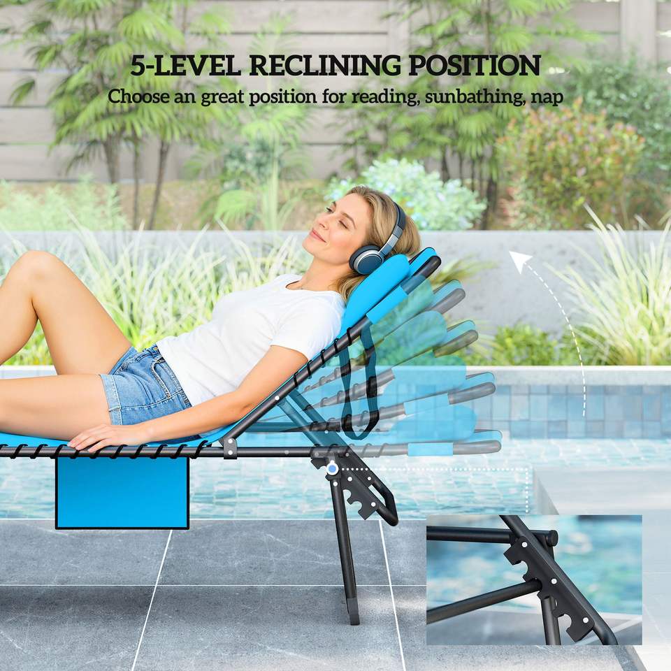 Set di 2 Sedie a Sdraio Pieghevoli Blu per Piscina e Spiaggia con Schienale Reclinabile a 5 Livelli, Foro per la Lettura e Tasca Laterale