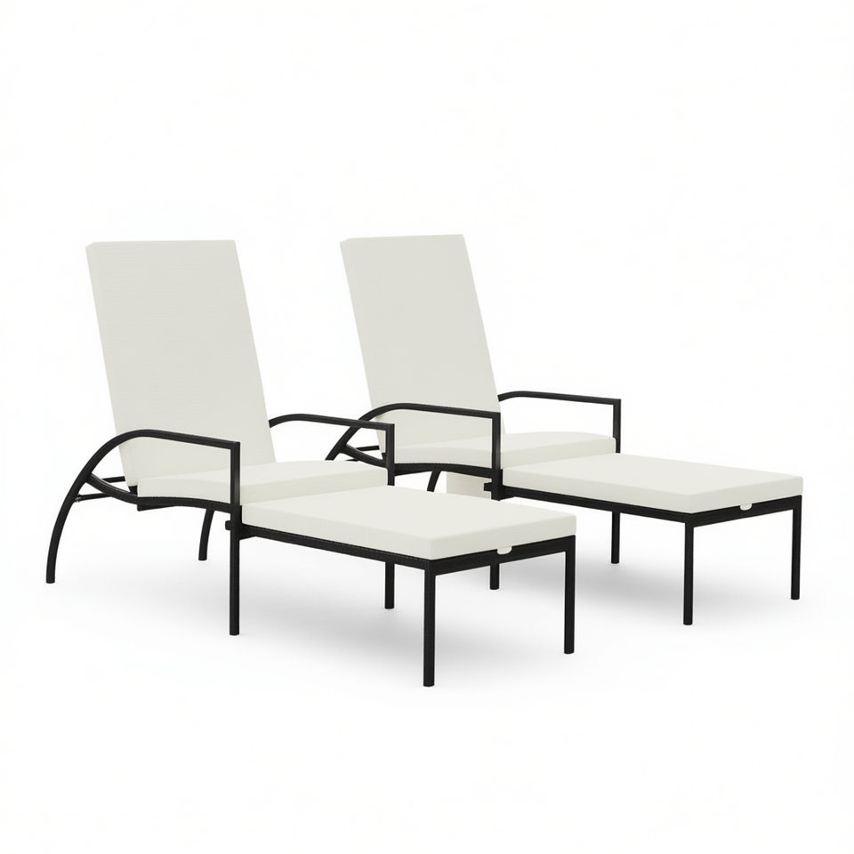 Set di 2 Lettini Prendisole con Telaio in Metallo Nero, Cuscino in Olefin e Poggiapiedi, Sedia Reclinabile da Esterno dal Design Moderno