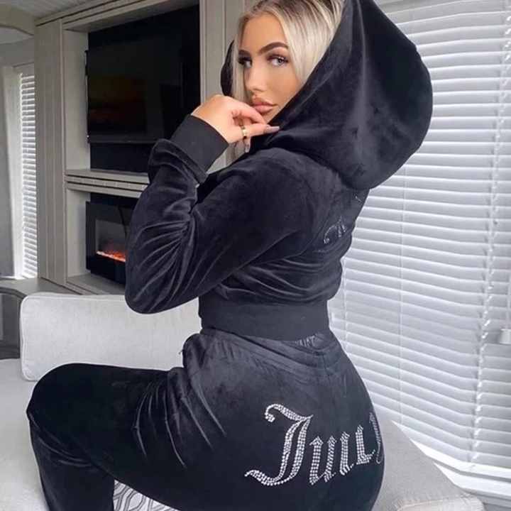 Set Due Pezzi da Donna all'Ingrosso Personalizzato in Velluto con Strass Tuta Sportiva Pantaloni e Felpa con Cappuccio
