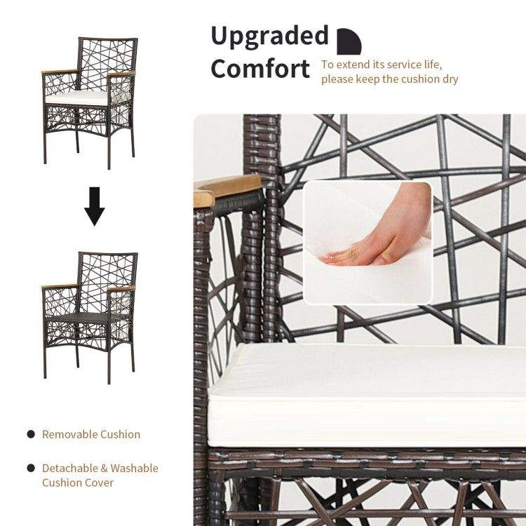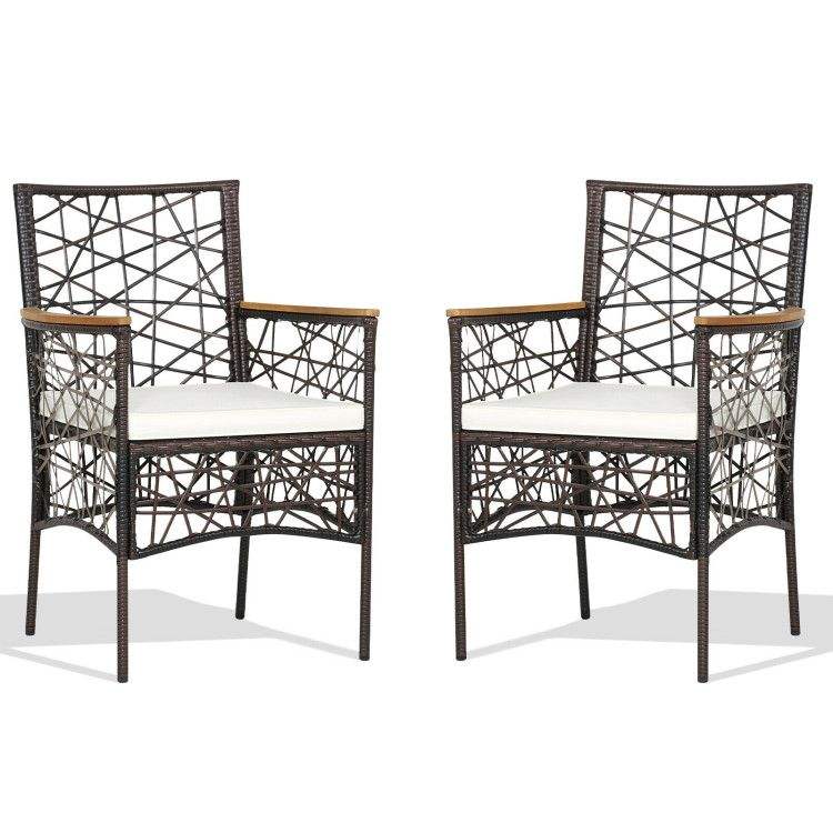 2 sedie da pranzo da patio in vimini PE con braccioli in legno di acacia e cuscini