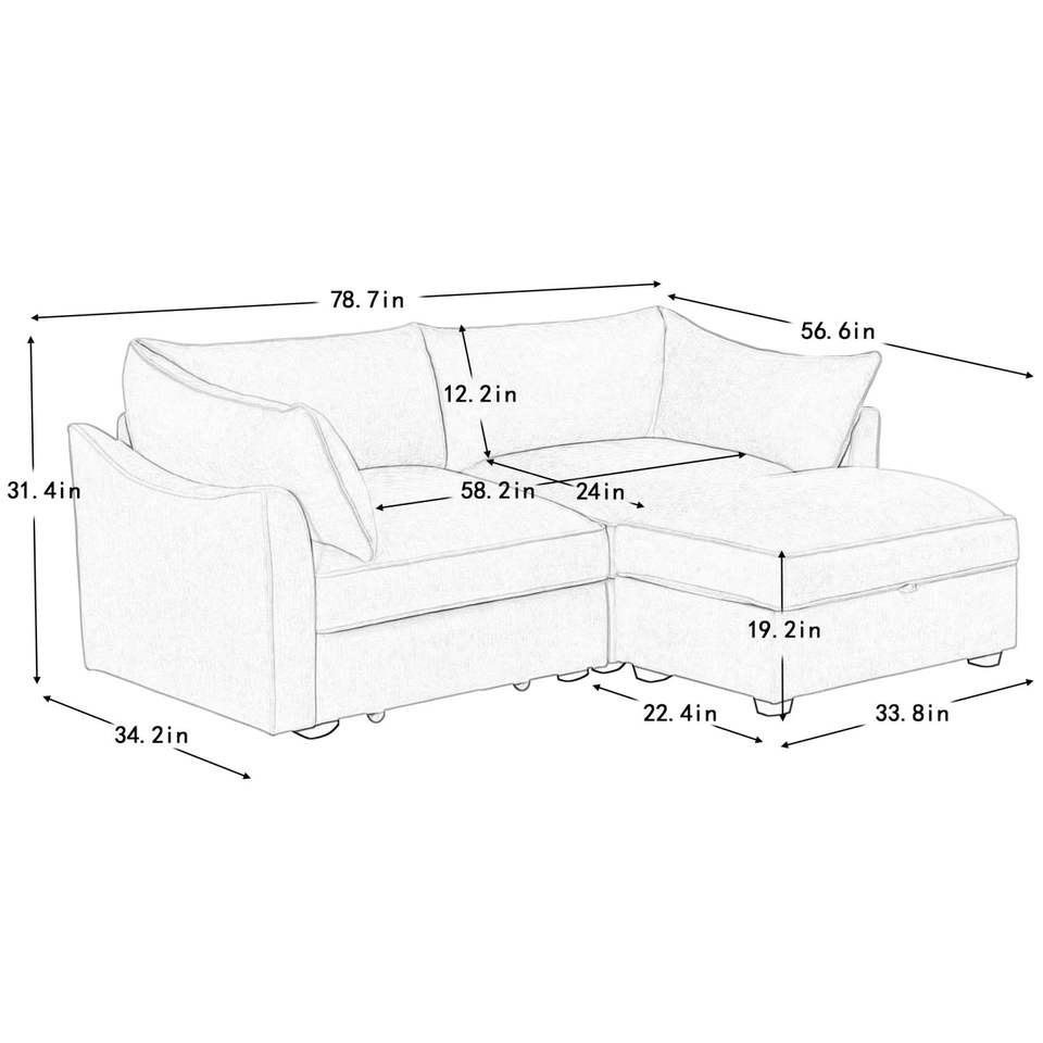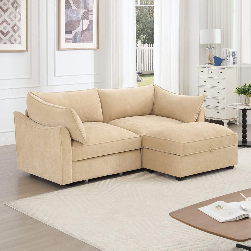 2-Seater Soft Chenille Color Wheat Sofa Movable Ottoman Wide Deep Seat Pull Storage Drawer Comfortable Footrest Living Room