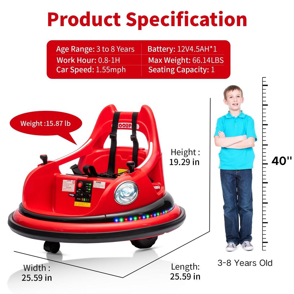 Auto Elettrica Bumper Car a 2 Velocità 12V per Bambini 2-4 Anni con Telecomando per Genitori, Rotazione a 360°, 5 Modalità di Illuminazione, Musica e Batteria