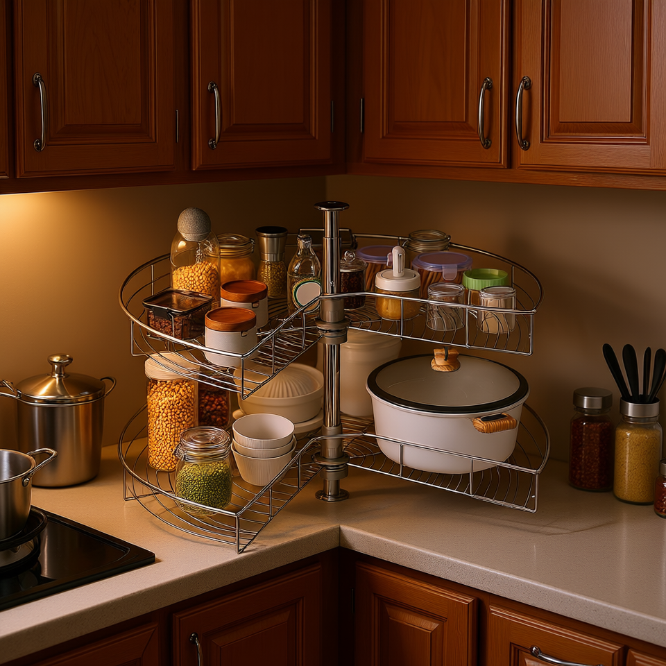 2 Tier Chrome Corner Organizer With Lazy Susan For Kitchen Cabinet Blind Corners Storage Solution