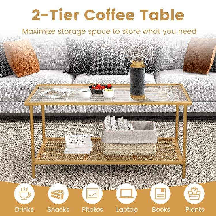 Tavolino da Caffè a 2 Livelli con Piano in Vetro Temperato e Ripiano Centrale per Esposizione di Tè e Bevande