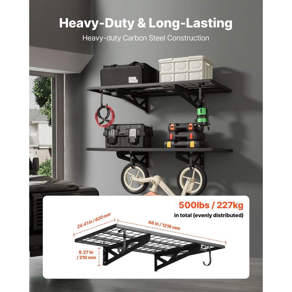 Scaffalatura a 2 livelli in acciaio resistente per garage, montaggio a parete, 2 x 4 piedi (24 x 48 pollici) per ripiano, 24 ganci, design a sospensione