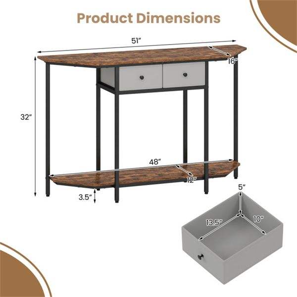 Consolle Industriale a 2 Livelli con Ripiano Aperto Poligonale e 2 Cassetti Pieghevoli in Tessuto per Ingresso, Corridoio o Divano