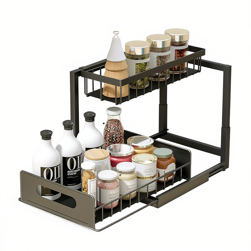Scaffale Estraibile a 2 Livelli per Sottopensile, Organizzatore da Cucina in Metallo dal Design Minimalista, Contenitore per Alimenti