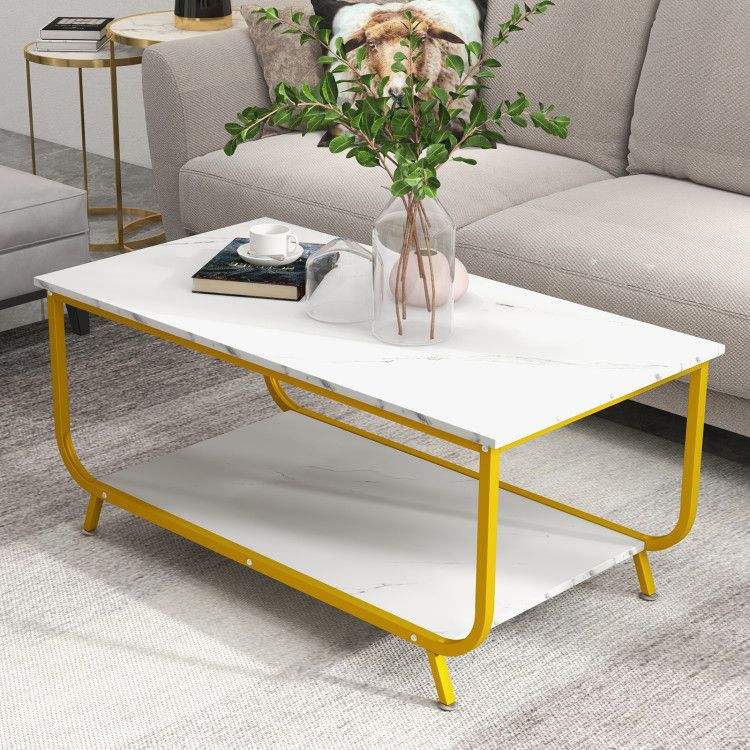 Tavolino da Caffè Rettangolare a 2 Livelli con Piano in Finto Marmo e Struttura in Metallo