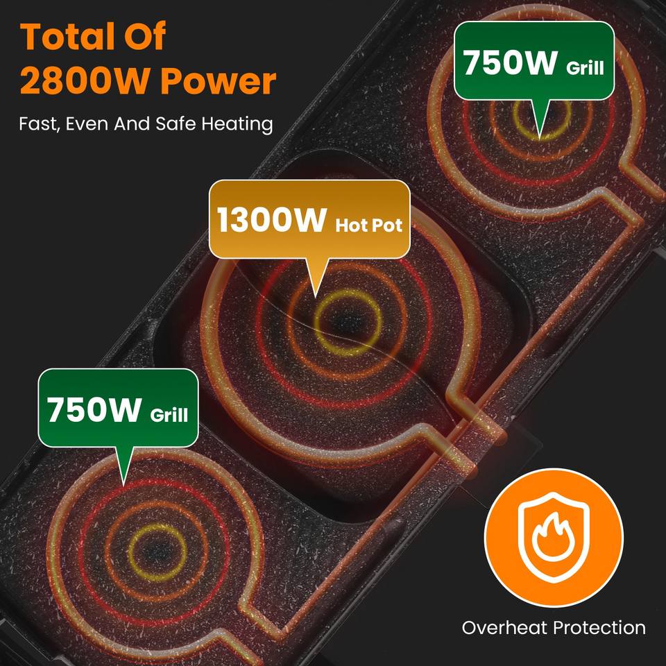 2-in-1 2800W Electric Hot Pot Korean BBQ Grill Non-Stick Shabu Shabu Combo Independent Temperature Control 5 Gears Firepower
