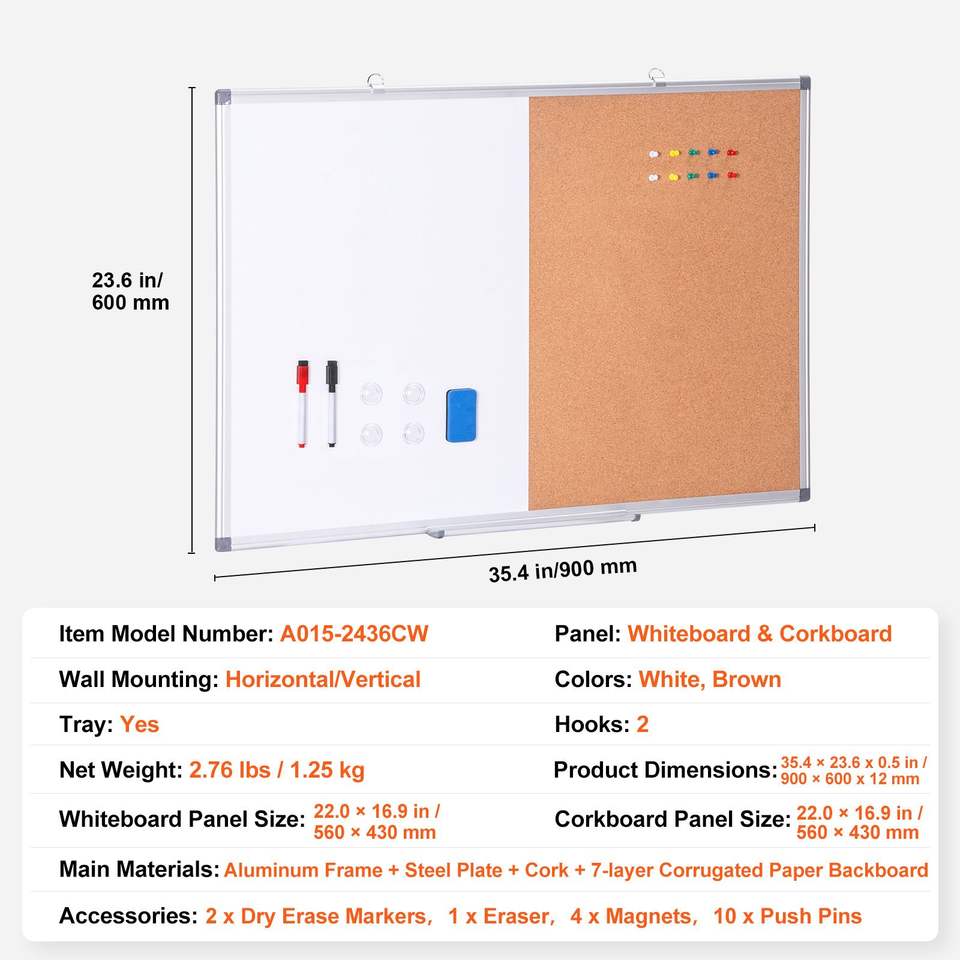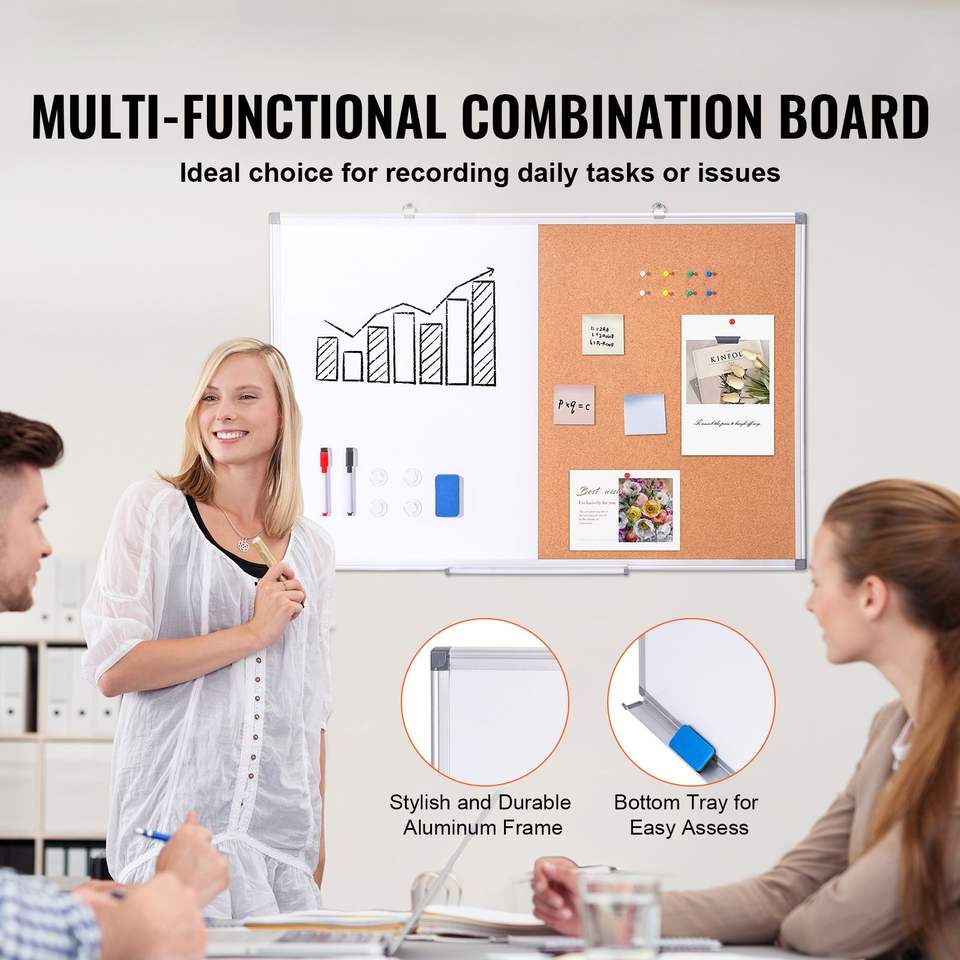 Lavagna Magnetica 2-in-1 con Cornice in Alluminio 36"x 24" e Pannello in Sughero, Montabile a Parete, Cancellabile a Secco