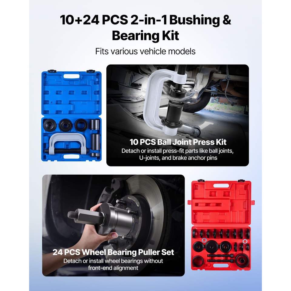 Kit Estrattore Cuscinetti Ruota e Pressa Snodo Sferico 2-in-1, 10+24 Pezzi con Set di Inserti per Guarnizioni e 13 Boccole, Strumento per Manutenzione Veicoli