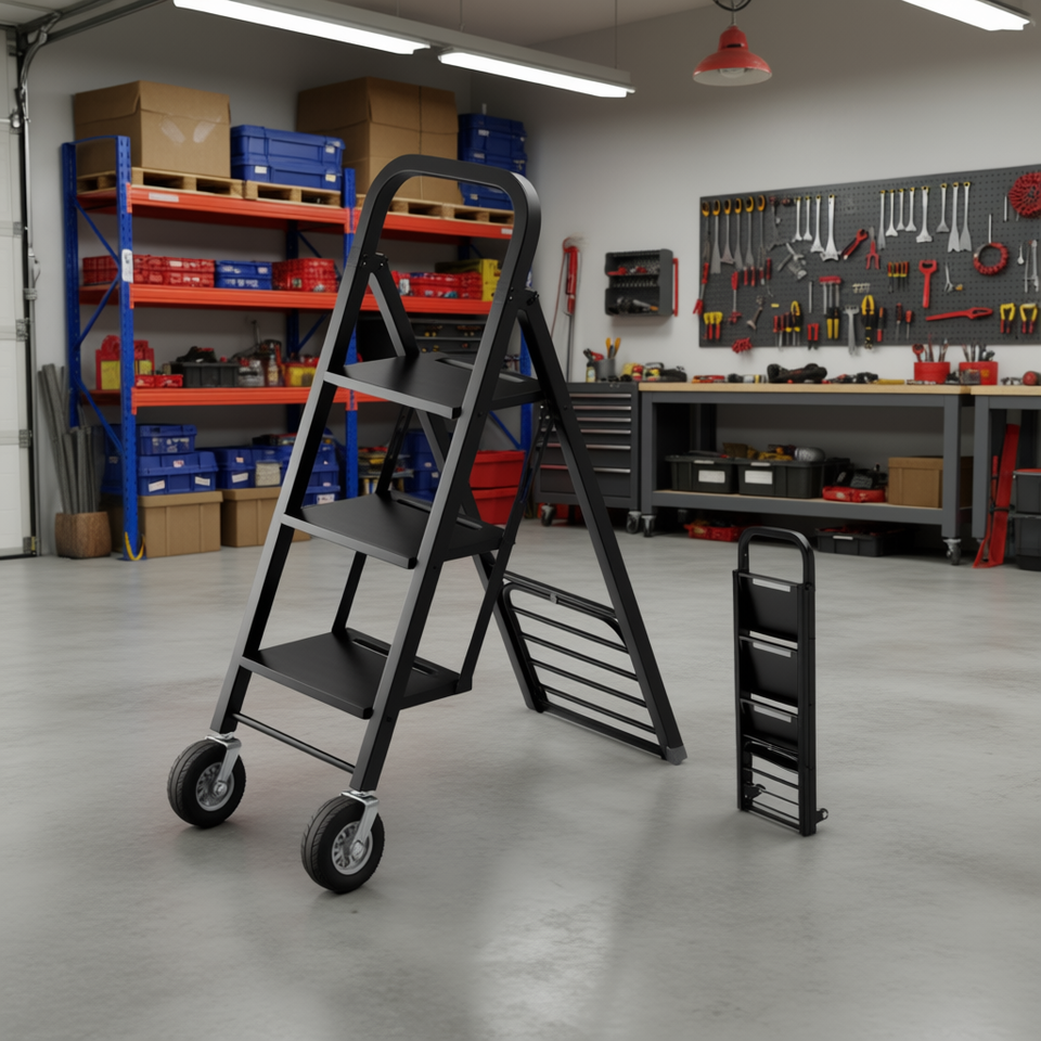 Carrello e scala 2 in 1 in acciaio, 4 gradini, 6 piedi, telescopico, per uso domestico e in garage
