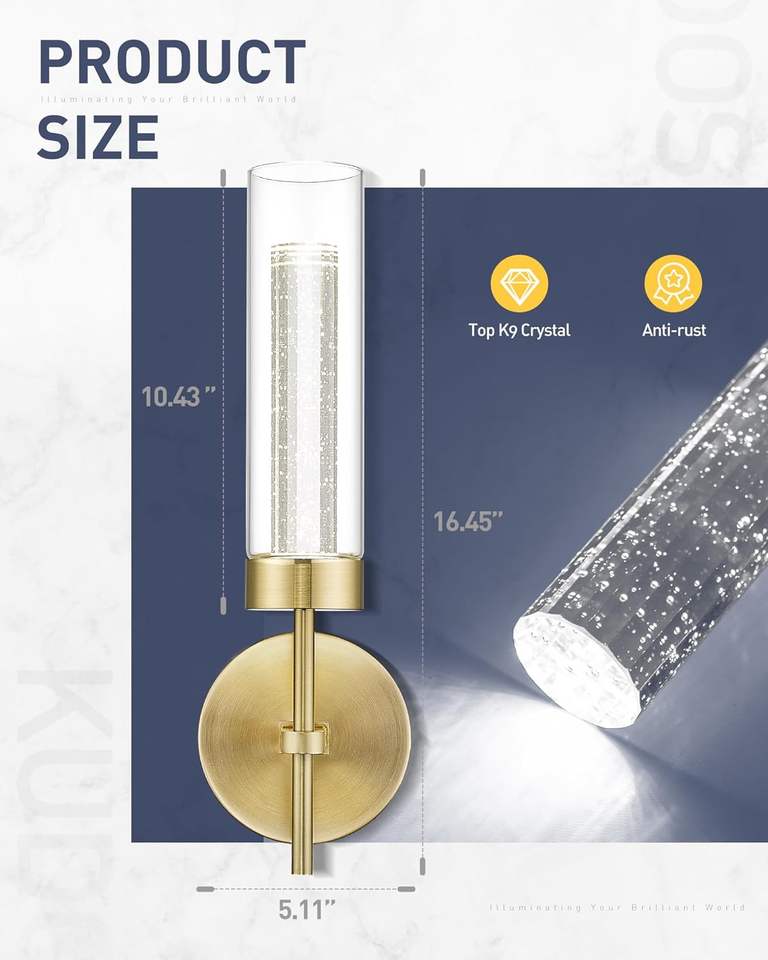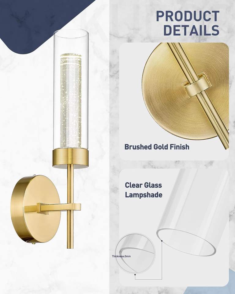 2-luci K9 lampade a parete di cristallo camera da letto bagno paralume in vetro 3CCT oscuramento oro spazzolato moderna lampada da parete a Led