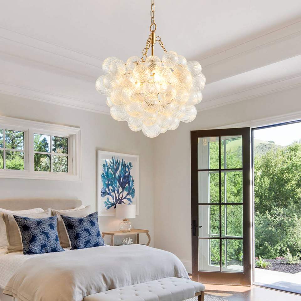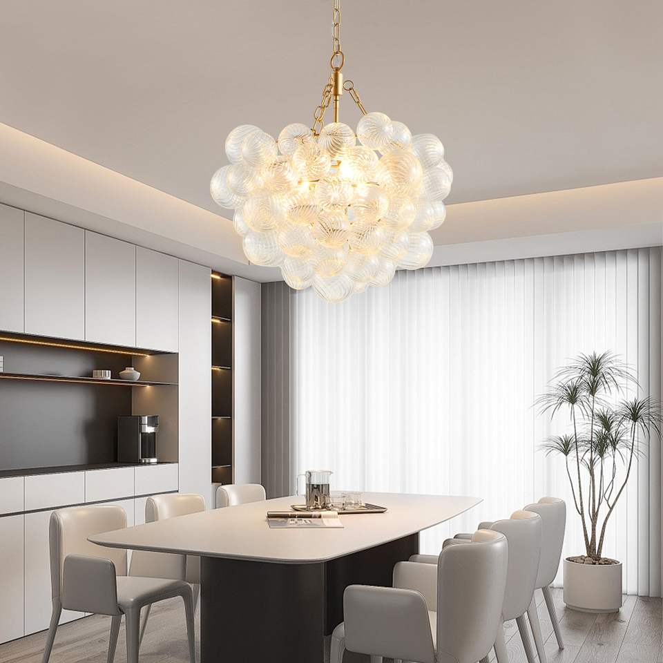 Lampadario a sospensione dorato da 20 pollici con paralume a globo in vetro trasparente, altezza regolabile per soggiorno e sala da pranzo