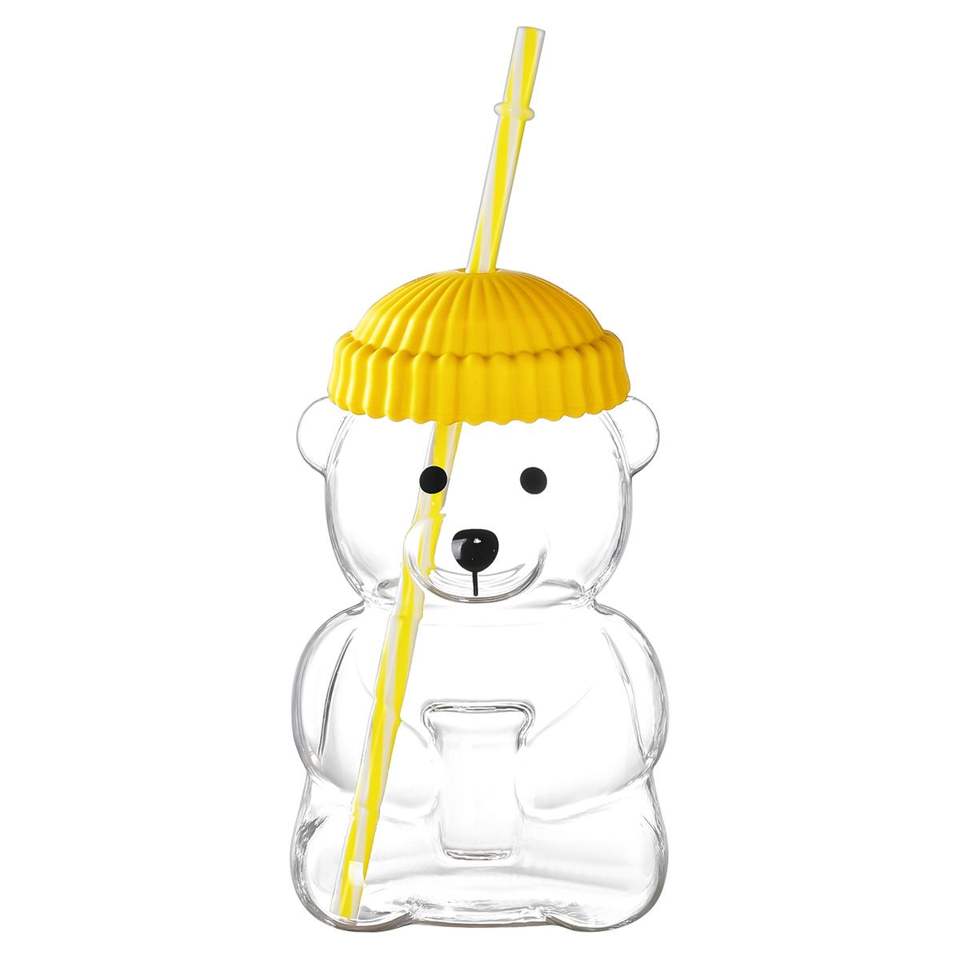 Bicchiere in Vetro Borosilicato Resistente al Calore con Cannuccia, 20 OZ, Design Orsetto Giallo, per Succhi, Latte e Bevande Fredde