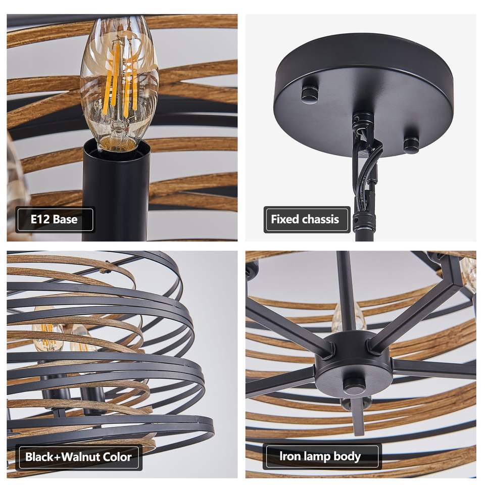 Lampadario a sospensione rustico industriale a 5 luci da 20 pollici, gabbia in metallo nero noce con dettagli in legno per isola cucina e sala da pranzo (senza lampadine)