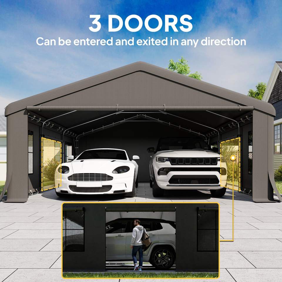 Tenda Garage Portatile 20x20 per Auto, Grigio Scuro, Resistente, con 3 Porte Avvolgibili e 4 Finestre, Modello D0100XFICGG