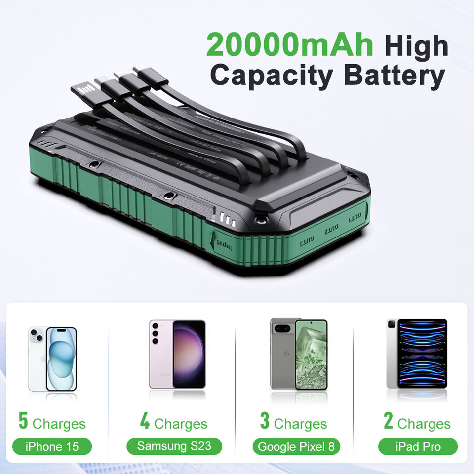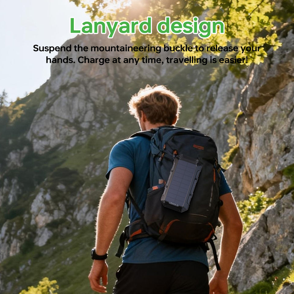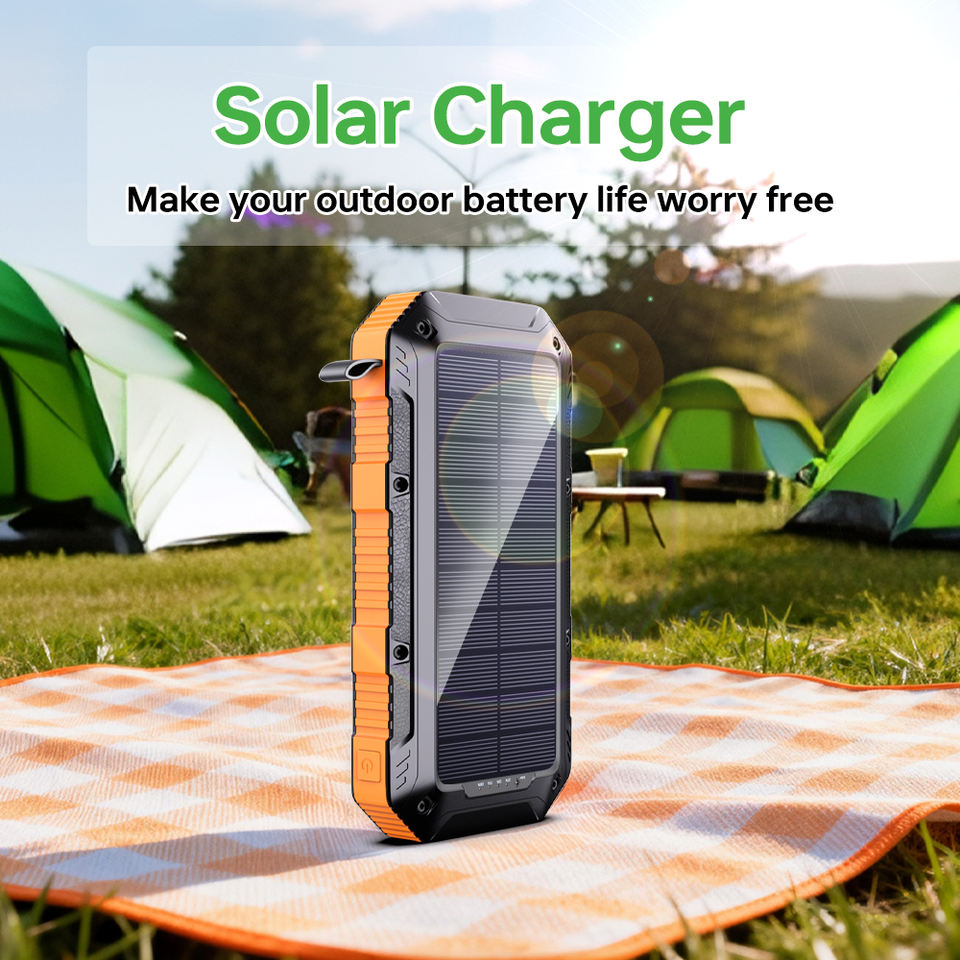 Power Bank Solare Portatile da 20000mAh, Impermeabile, Design Compatto, Doppio Ingresso USB e Type-C per Viaggi Internazionali e Campeggio