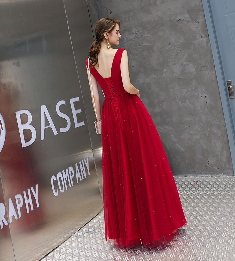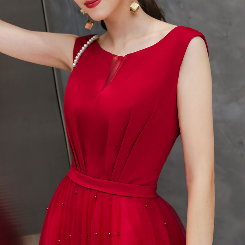 2019 Maxi Bridesmaid Dresses New Fashion Sleeveless O Neck Long Red Pearl Decorated Wedding Party Evening Dresses