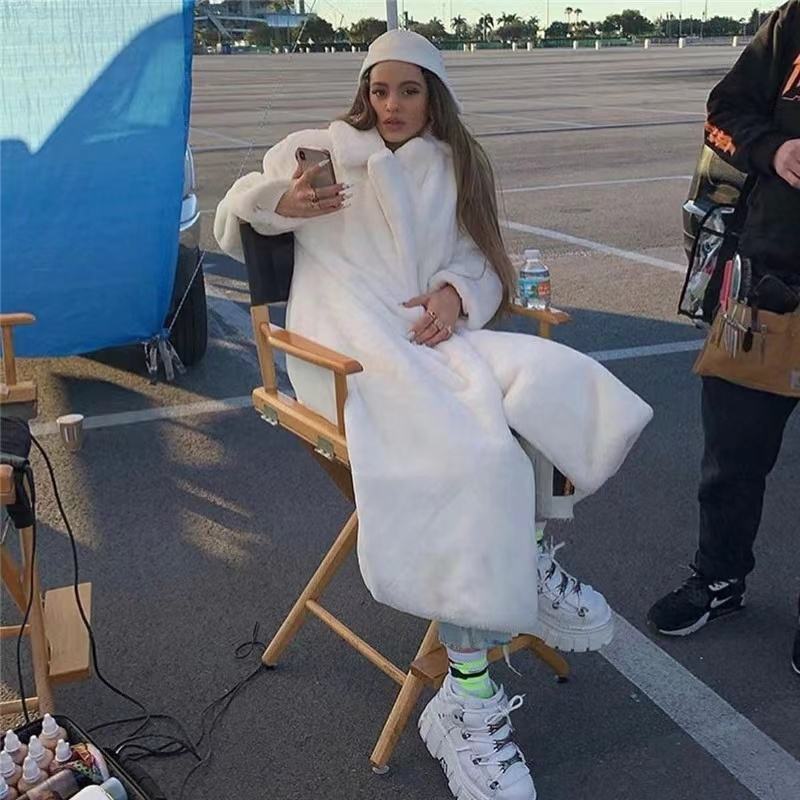 2021 Korean Fashion Fluffy Oversize Faux Fur Coat for Women White Winter Warm Long Outerwear Hood Lapel Sashes Cotton Padding