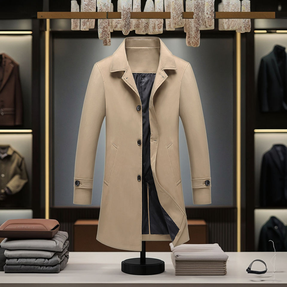 2021 Men's Business Casual Slim Waterproof Blazer Long Trench Coat with Button Decoration 100% Polyester Spring Autumn Outerwear