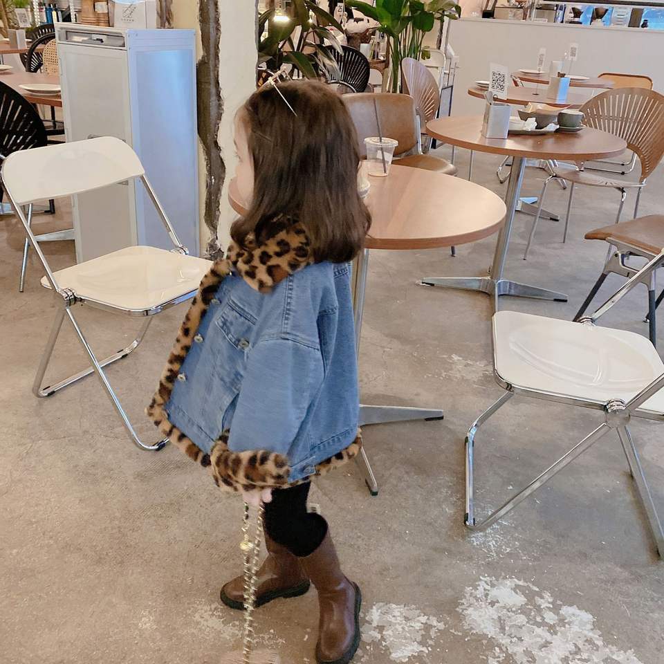 2021 Winter Leopard Denim Puffer Jacket for Girls Kid's Short Length Snow Coat Mink Fur Plaid Pattern Fashionable Jean Jacket