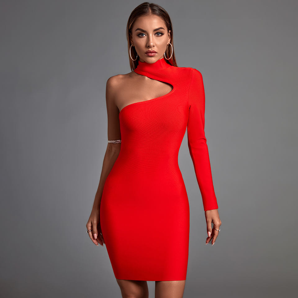 2022 New Arrivals Spring Ladies Sexy Cut Out Asymmetrical Mini One Sleeve One Shoulder Bandages Dresses Long Sleeve Party Dress