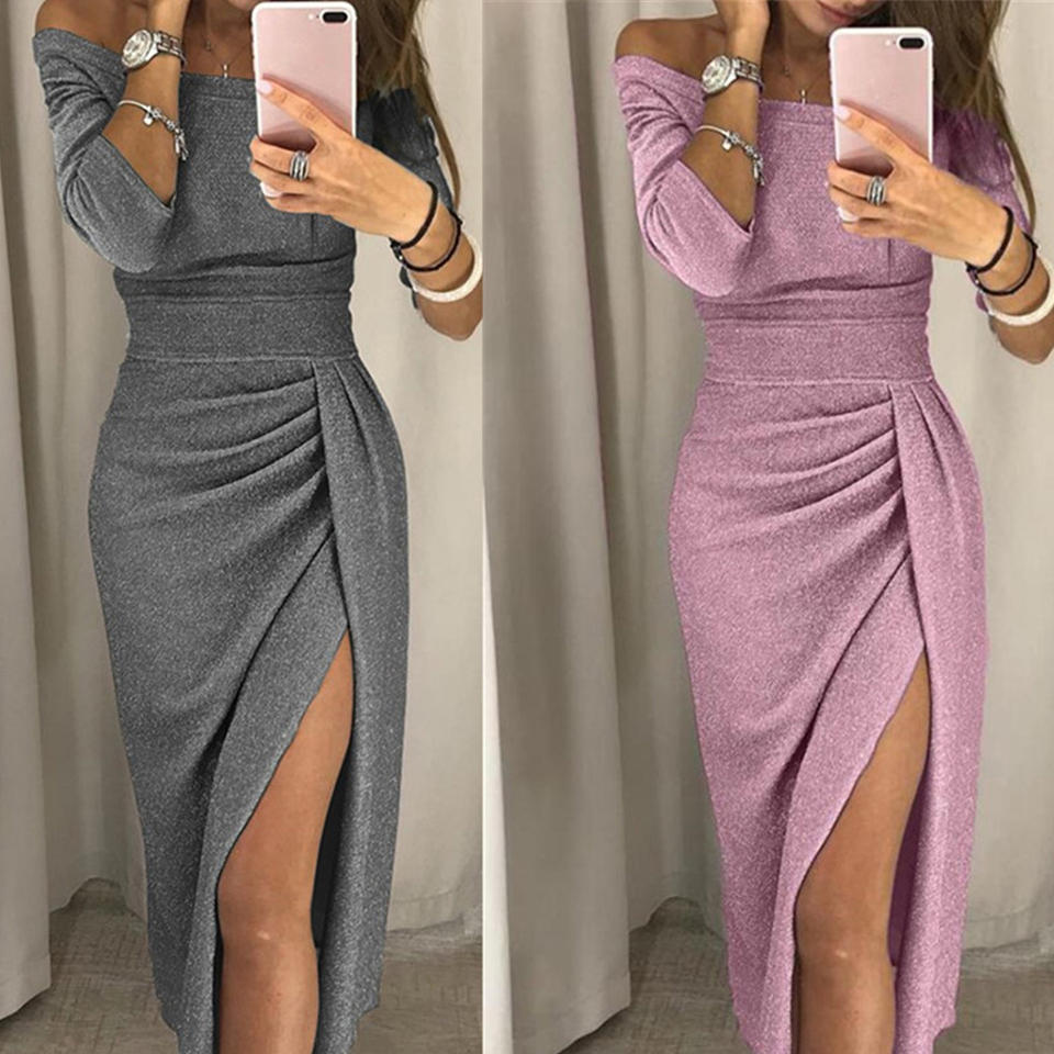 2022 New Fashion Women's Long Sleeve Evening Formal Bling Dress Solid Pattern Off-Shoulder Party Slit Dress for Wholesale