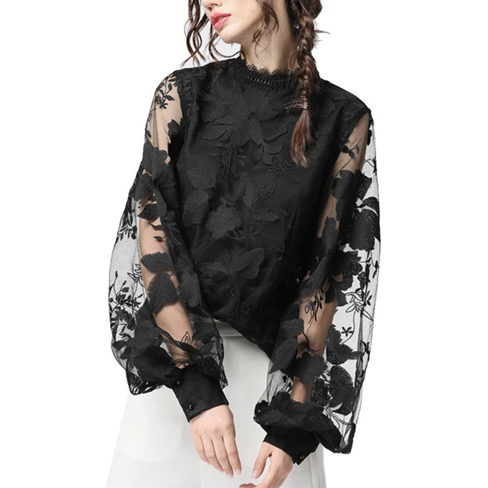 2022 Women Lace Puff Sleeve Hollow Out Mesh Black Flower Shirts O-neck Ladies Sexy Sweet Casual Long Sleeve Blouse Shirt