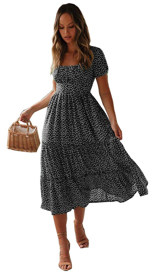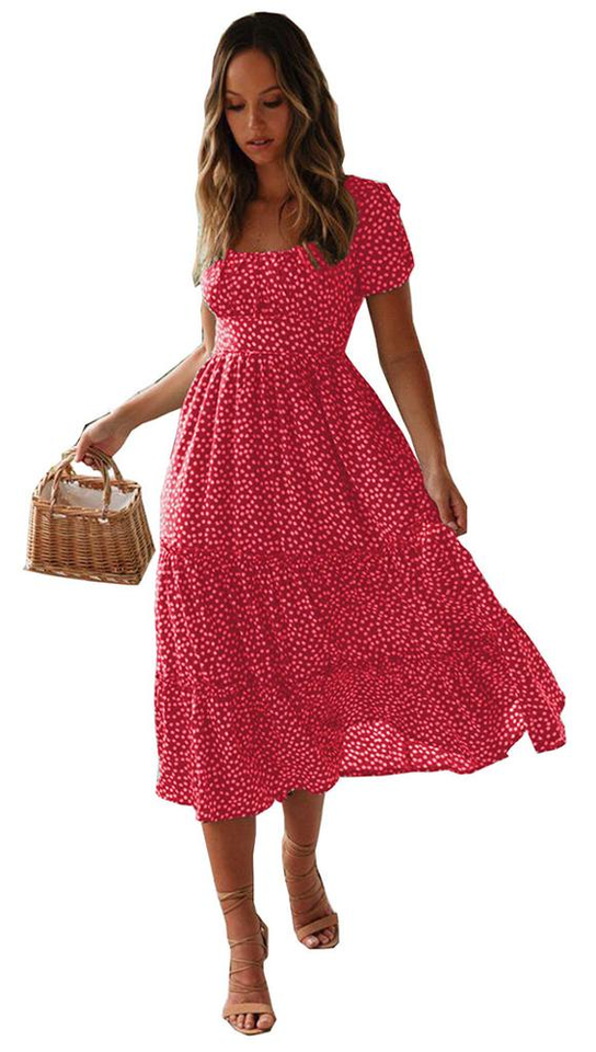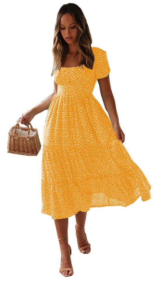 2022 Women's Casual Floral Dress with Square Collar Long Short Sleeves Big Hem Natural Waistline Plain Dyed Summer Clothes