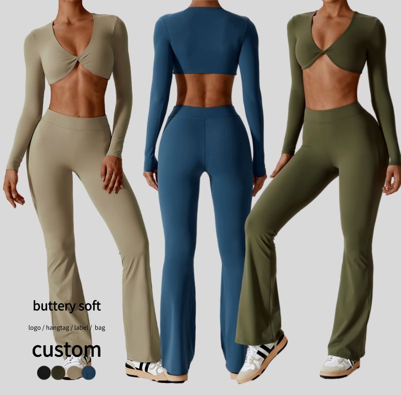 2023 Autumn New Sports 2 PCs Set Long Sleeve Shirt Sports Wide Leg Pants Yoga Suit Women Custom Tshirt Gym Leggings Active Set