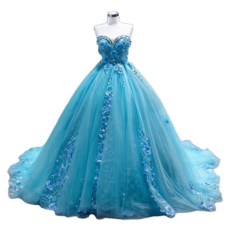 2023 Custom Women Elegant Lace Fabric 3d Flower Tube Top Beaded Blue Evening Dress