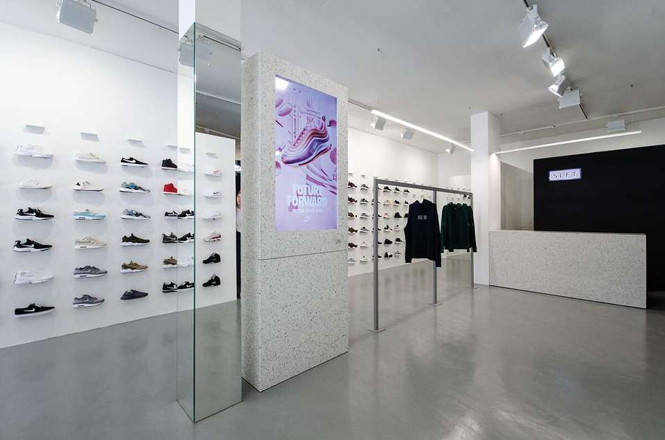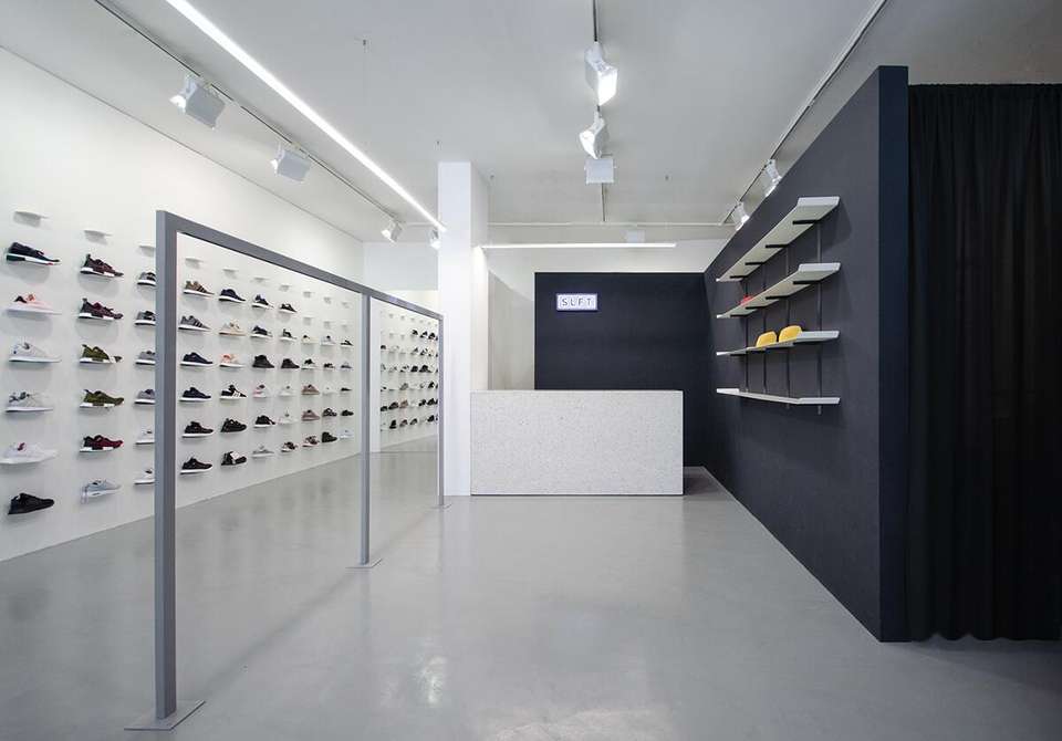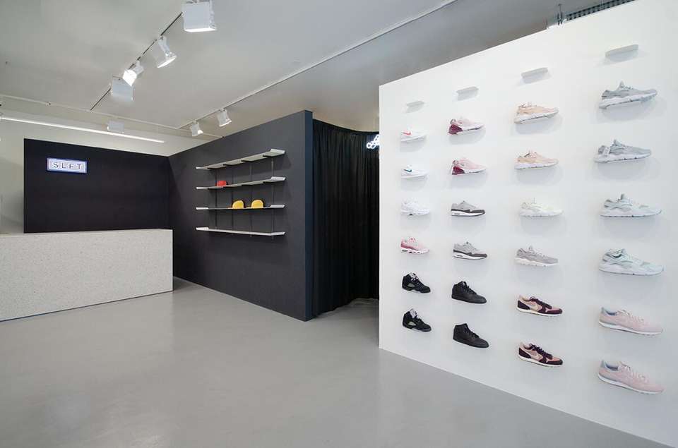 Idee di Design per Interni di Negozi di Calzature 2023, Espositori a Parete con Doghe per Negozi di Scarpe