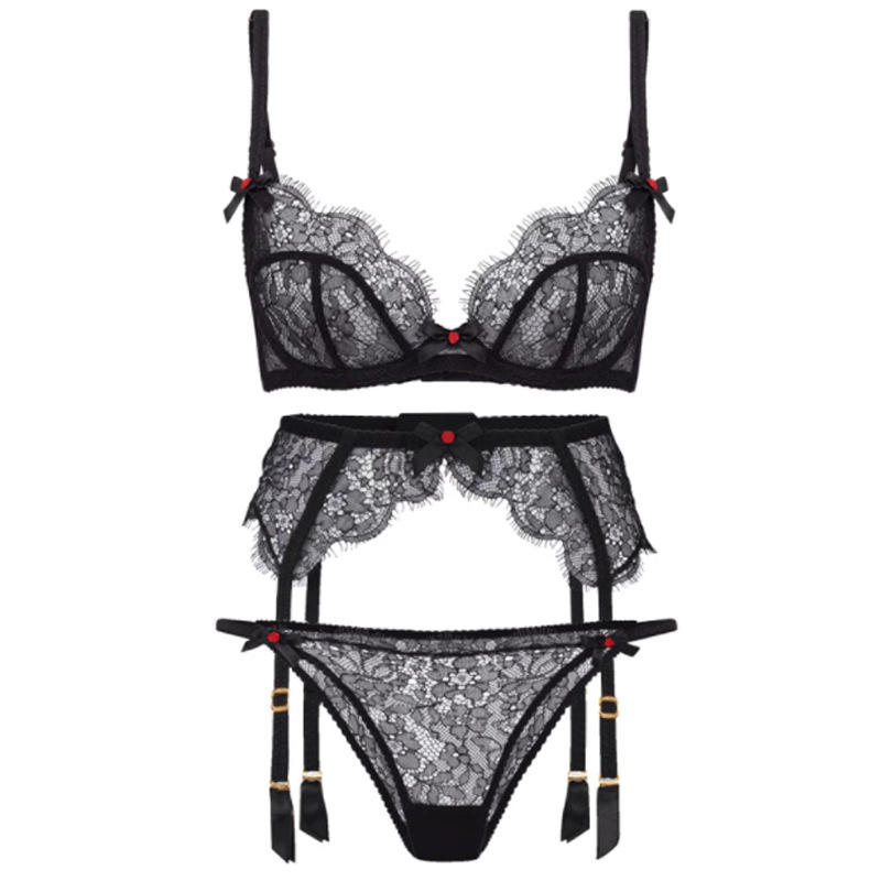 2023 Good Quality Black Lace Eyelash Sheer Women Hot Girl Wear Lingerie 3PCS or 2PCS Set Grande Taille Lingerie Sexy Gros Femmes