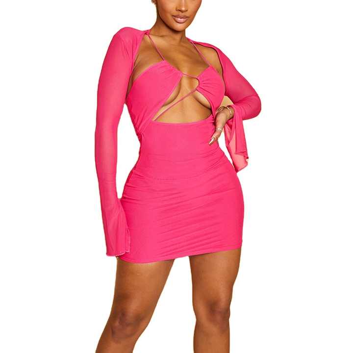 Abito 2023 estivo aperto da donna con colore rosa nuovo di tendenza collo irregolare manica lunga abiti da donna volant decorazione