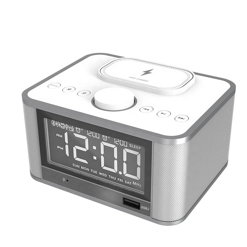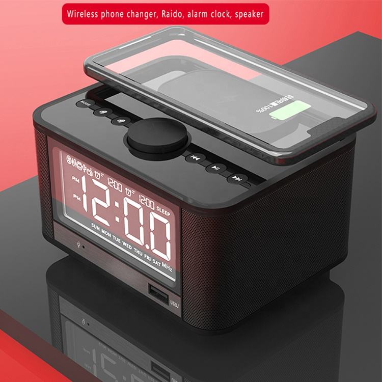 2023 nuovo arrivo Radio FM sveglia digitale con caricabatterie wireless stile moderno altoparlante musicale BT orologio da tavolo da tavolo