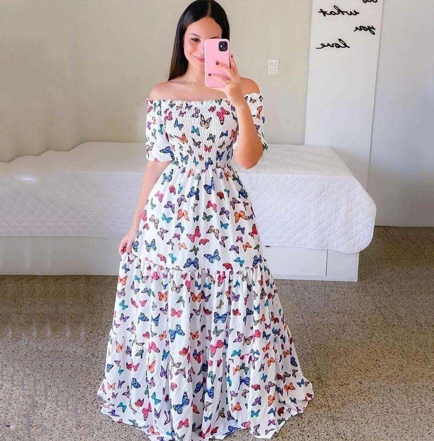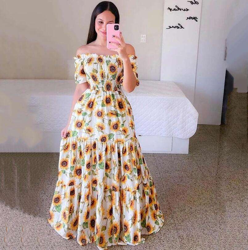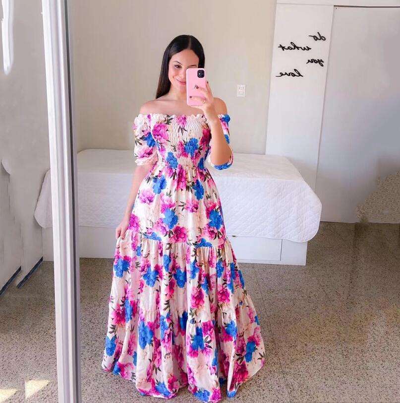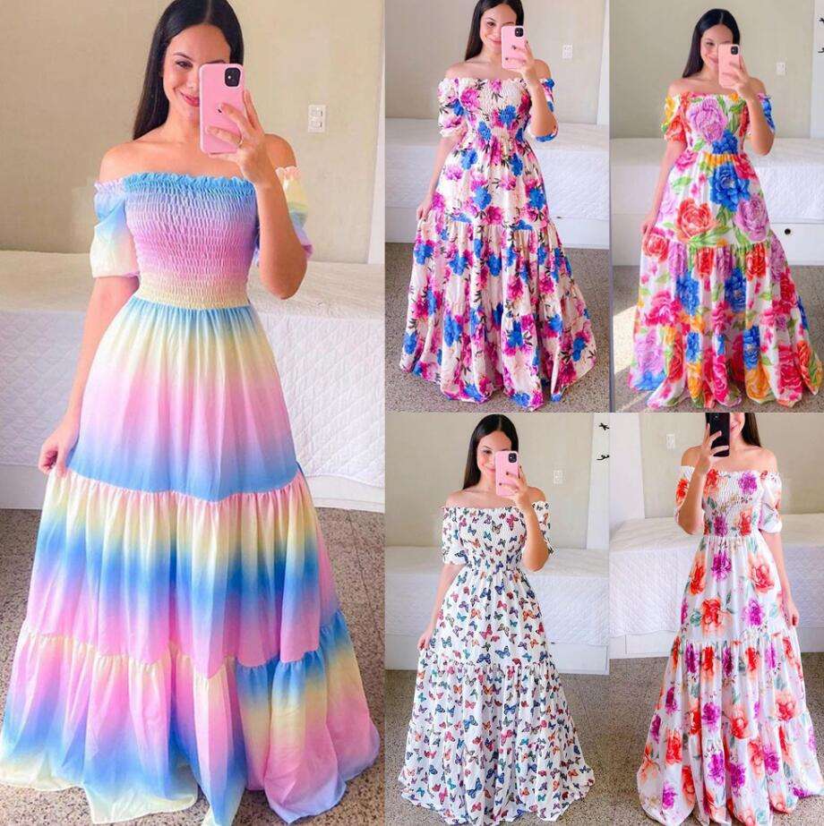 2023 New European and American Women's Dress for Spring and Summer One-shoulder Floral Fashion Off-shoulder Long Printed Dress