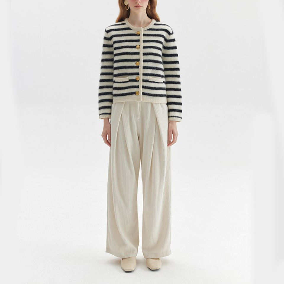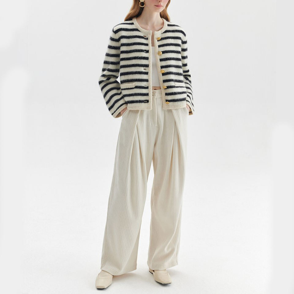 2023 New Fashion Sweater Coat Autumn Short 100% Pure Cashmere Sweater Women's Black and White Striped Wool Knitted Cardigan