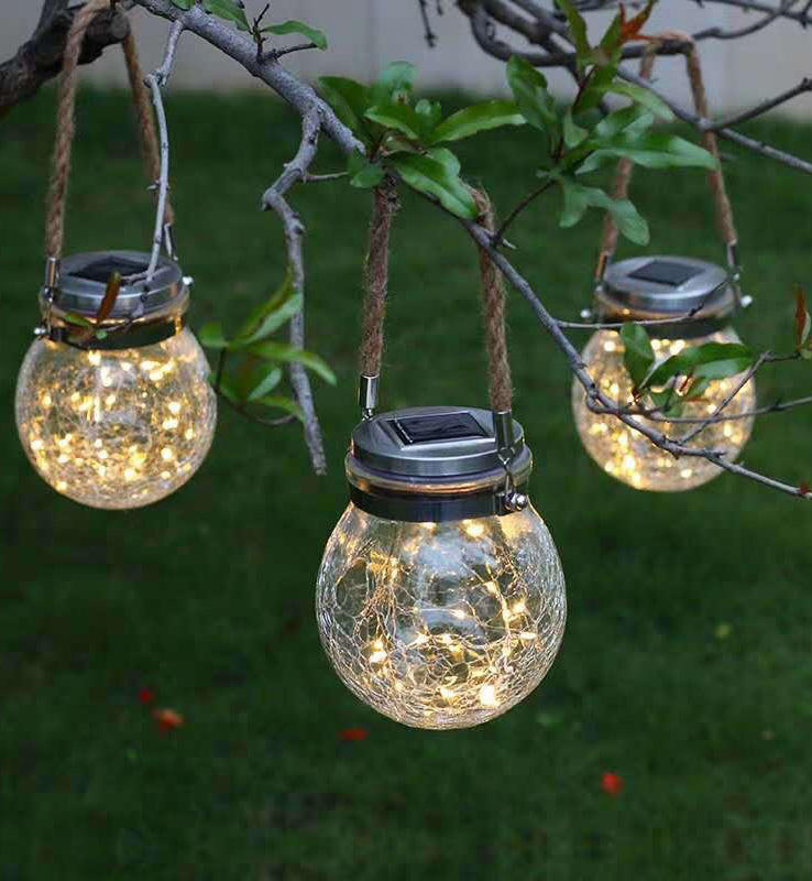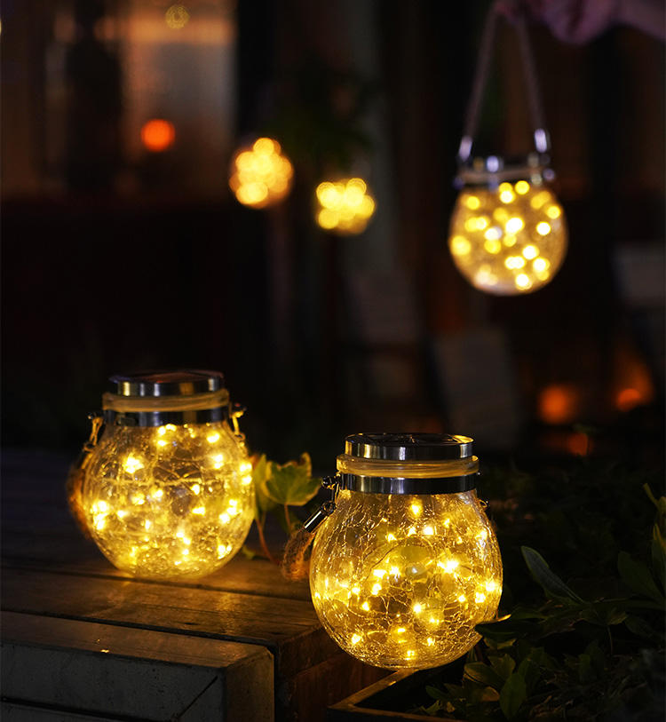 2023 Newest Hanging Mason Jar Solar Light Plastic Lid with Battery Beautiful Cracks on the Bottle for Outdoor