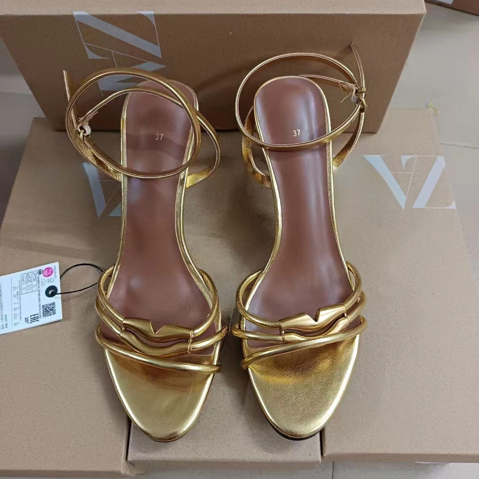 2024 Famous ZA Women's PU Golden High-Heeled Open Toe Sandals Evergreen Summer Outdoor Style Big Size 42