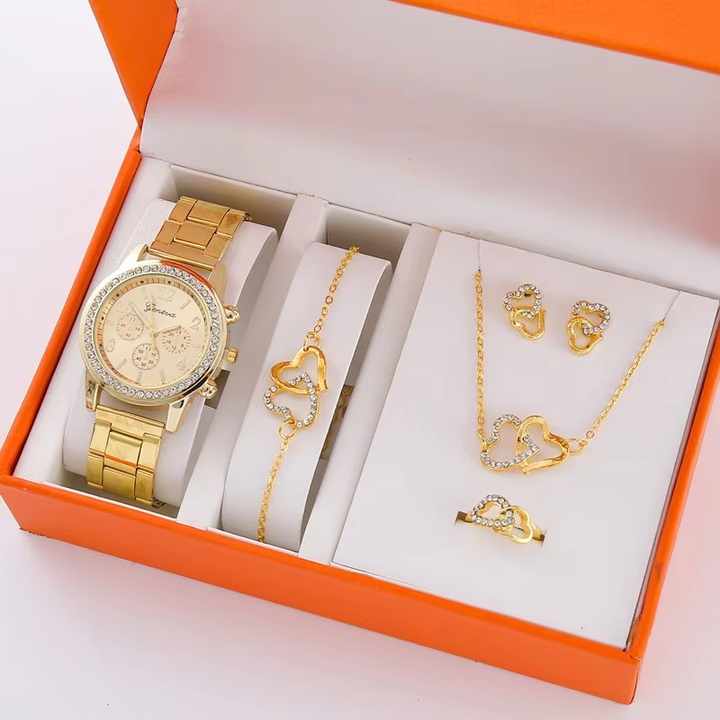2024 Fashion Women Quartz Watch 6PCS Set Luxury Watch Ladies Ring Necklace Earrings Rhinestone Fashion Watch Set