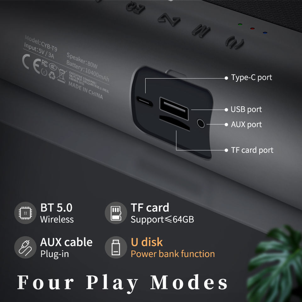 2024 New Arrival T9 80W Deep Bass Speaker 3 Horns Stereo Sound DSP Wireless AUX Speakers Micro Card Boombox 2.1 System 10400mAh