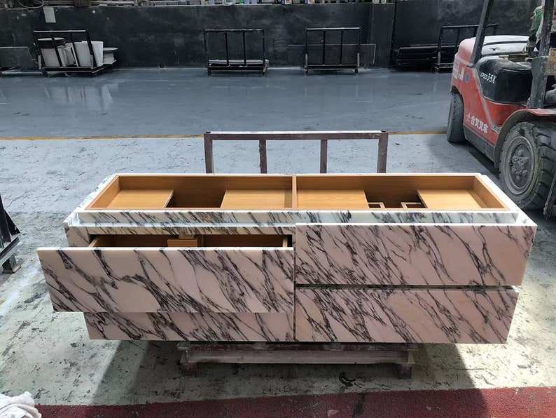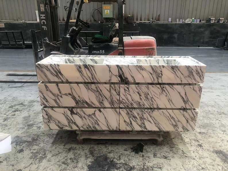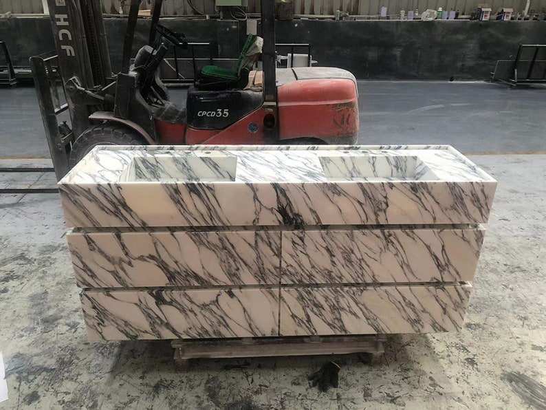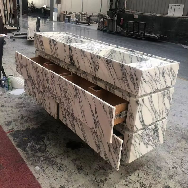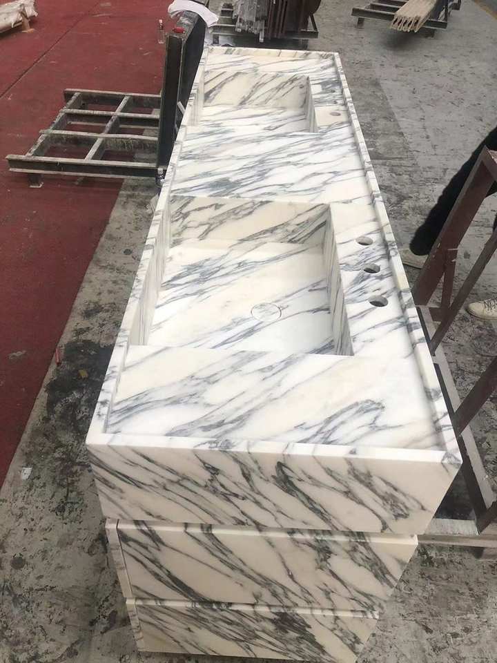 Mobile da Bagno Autoportante di Lusso Nuovo Design 2024 in Marmo Bianco Arabescato con Doppio Lavabo e Contenitore